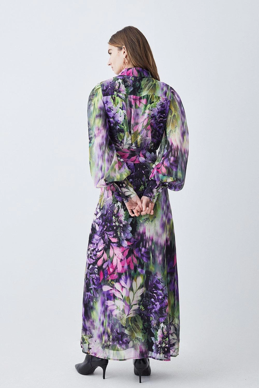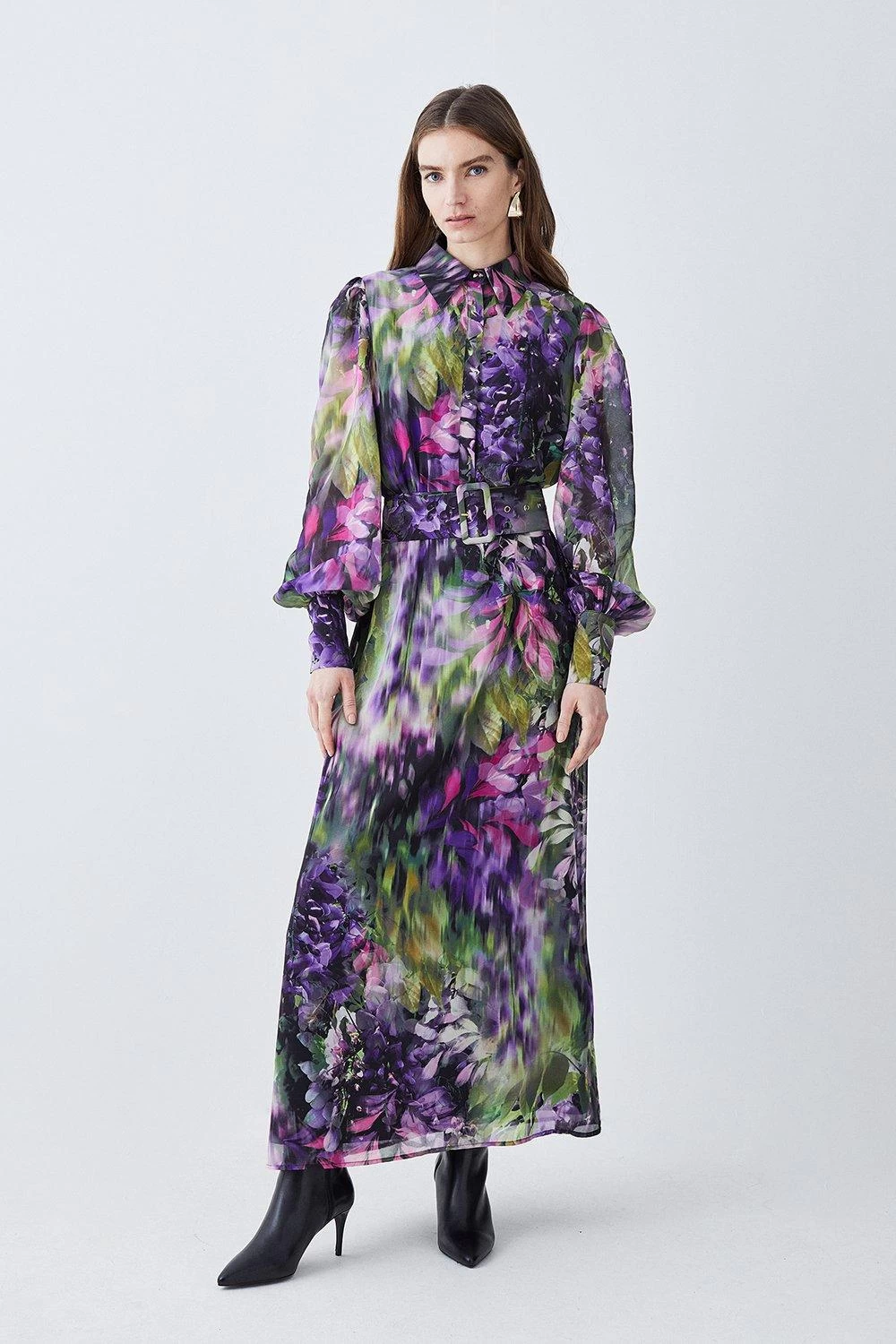 Encapsulate botanical beauty in this elegant midi dress. Balloon sleeves and a flowing midi skirt add an ethereal touch to this piece, while a collared neckline and buckle belt add a level of sophistication. The vibrant floral print is perfectly suited to a spring soiree, wedding, or race day.