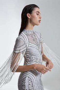100% polyester. Gentle machine wash at 30 with similar colours. Model wears a UK 8/US Size 6.