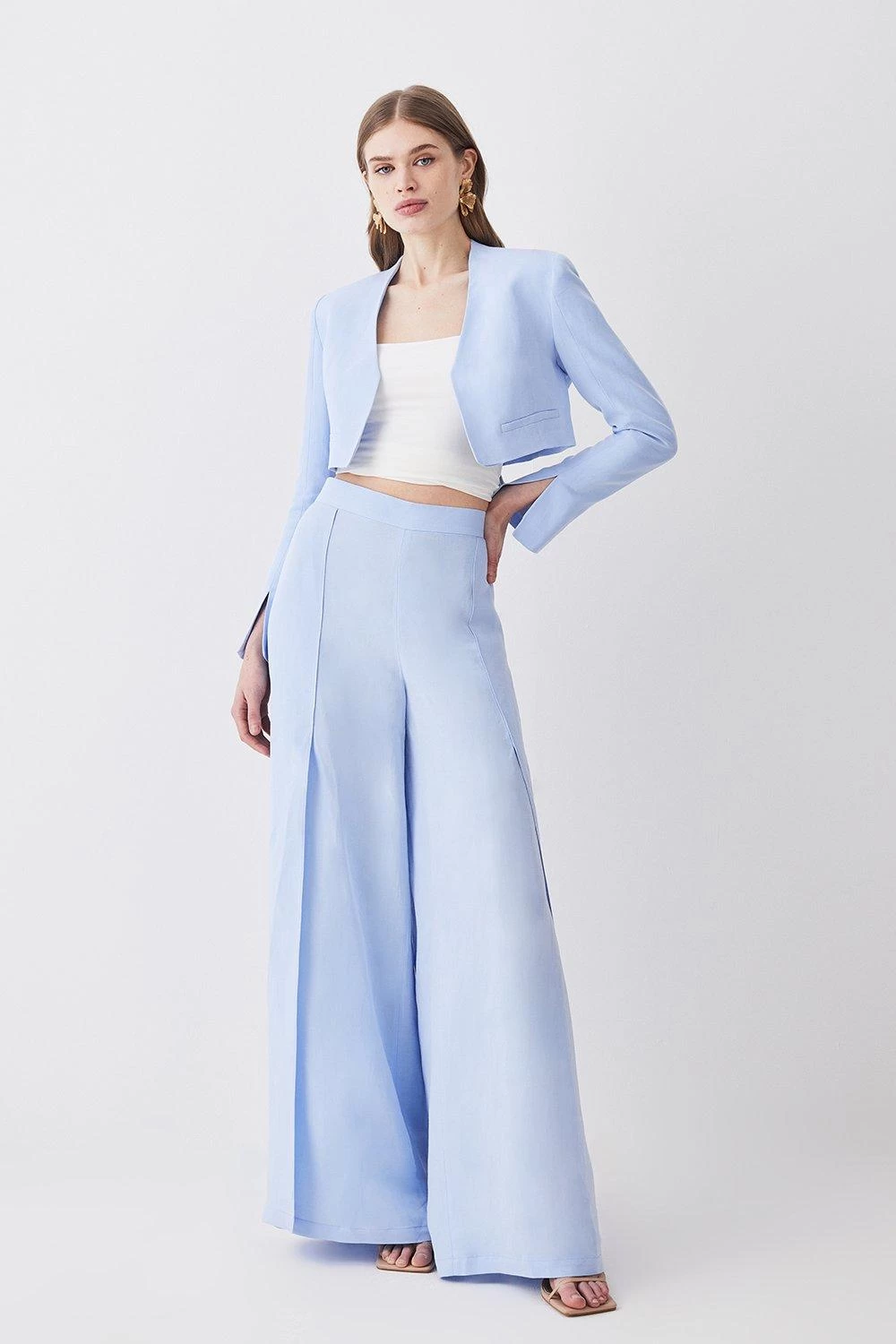 Showcasing a smooth and elegant appearance, this cropped jacket is crafted with linen for a lightweight and breathable fit. Split cuffs add a contemporary touch. Style this piece with the co-ordinating wide-leg trousers for a sophisticated wedding guest ensemble.