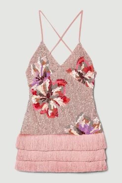 Adorned with infinite sequins and beadwork, this mini dress is a true showstopper. Floral motifs give this piece an elegant touch, while a multi-layered tassel hemline adds undeniable feminine flair.