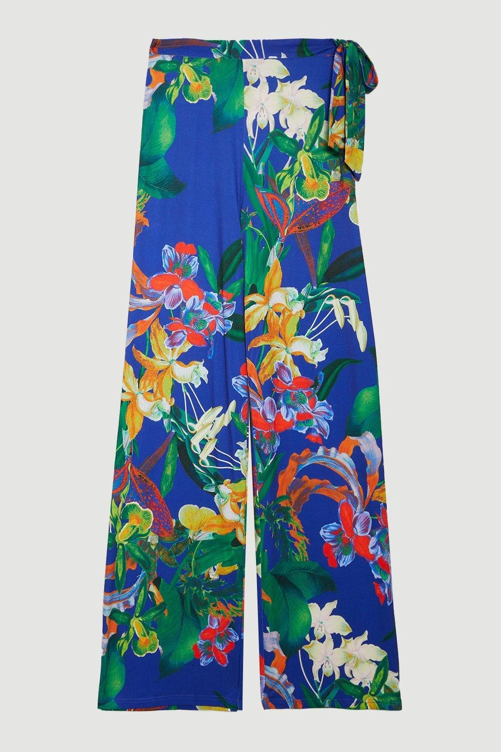 Embrace a summer mood in these vibrant trousers. Inspired by tropical flora, this pair is enlivened with vivid hues and floral motifs. A wide leg cut and tie belt naturally flatters the form, while lightweight jersey material adds warm-weather appeal.