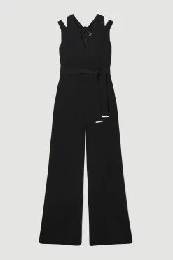 Showcasing a tailored wide-leg silhouette, this one-piece is panelled at the bodice and features a self-tie belt to further define the waist. The design features alluring cut-outs and a twisted-detail back for a unique touch.