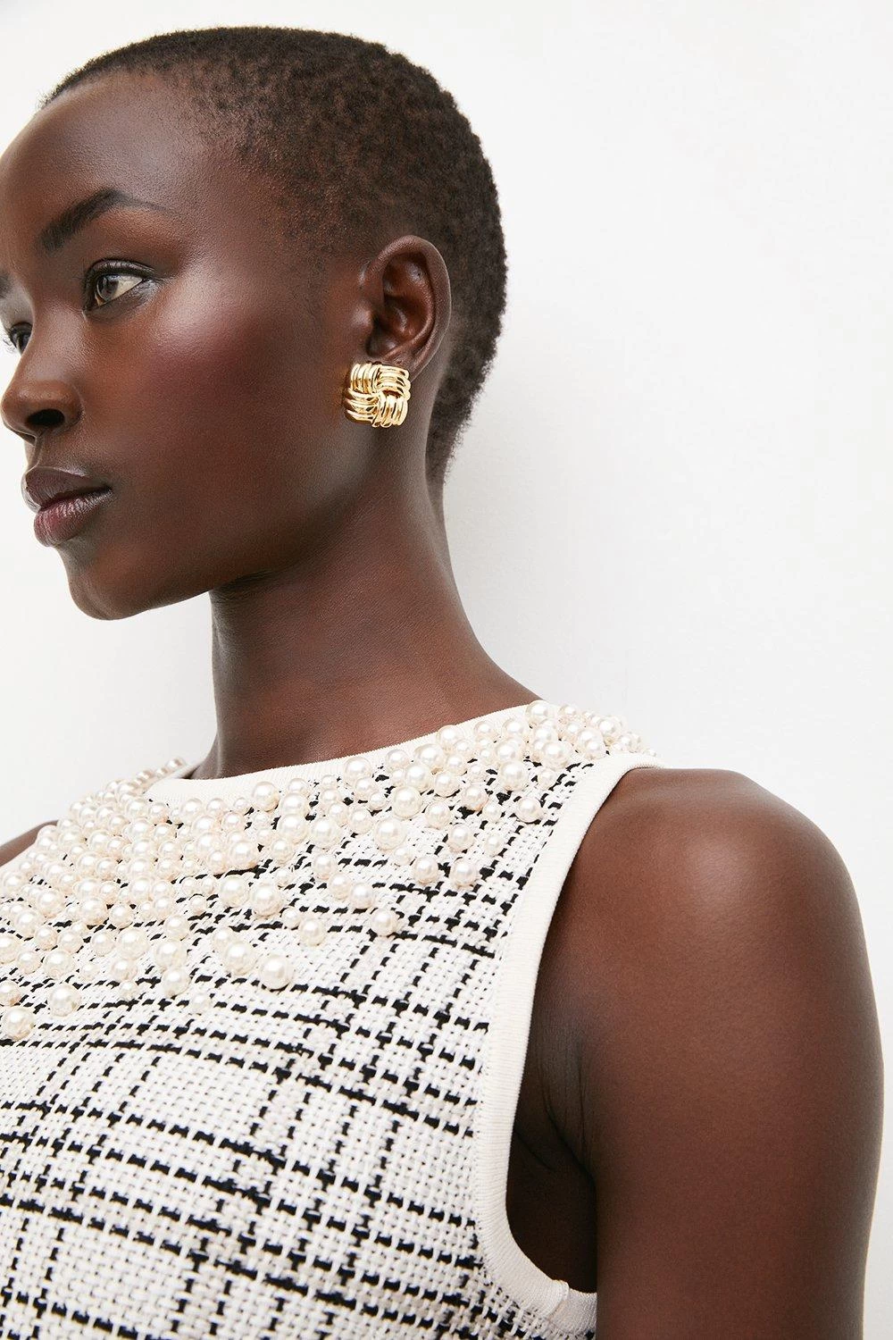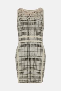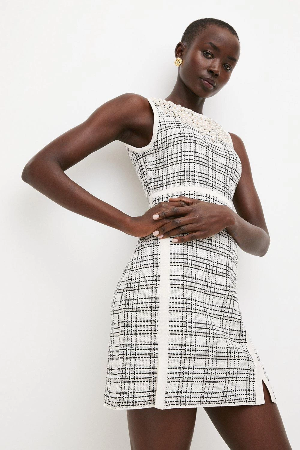 Light-catching pearls lend a unique touch to this sleek pencil dress. Cut to a simple, streamlined fit that shows off legs beautifully, this checked design blends ladylike appeal with a modern finish. Enhance the fuss-free, sleeveless fit and monochrome palette with chunky black heels and matching pearl earrings.