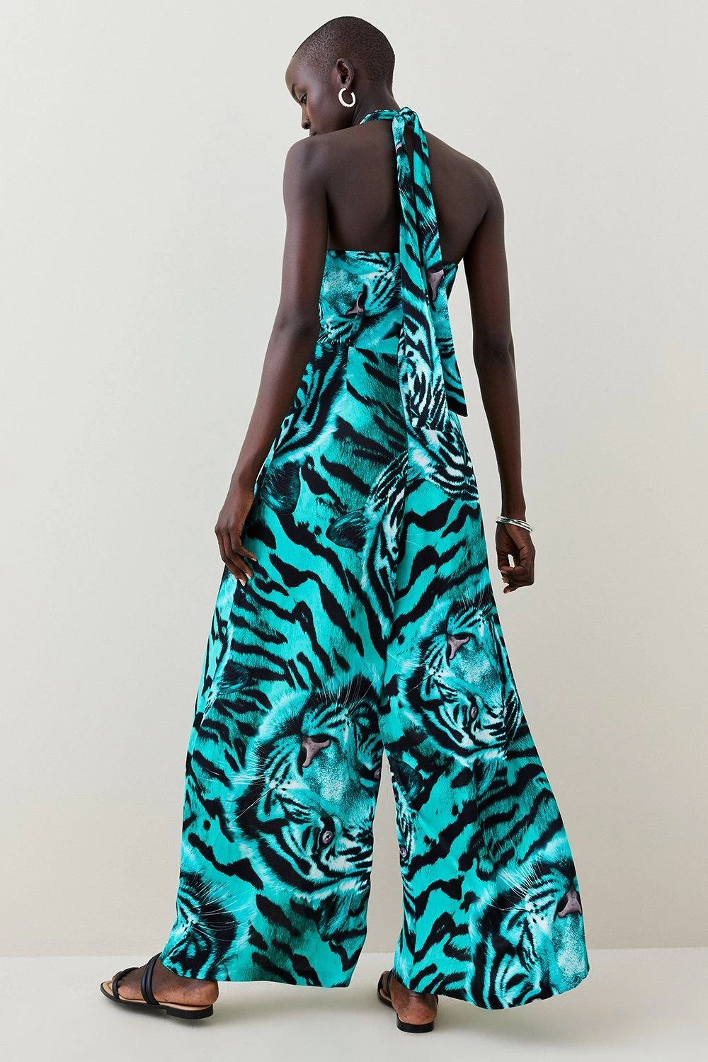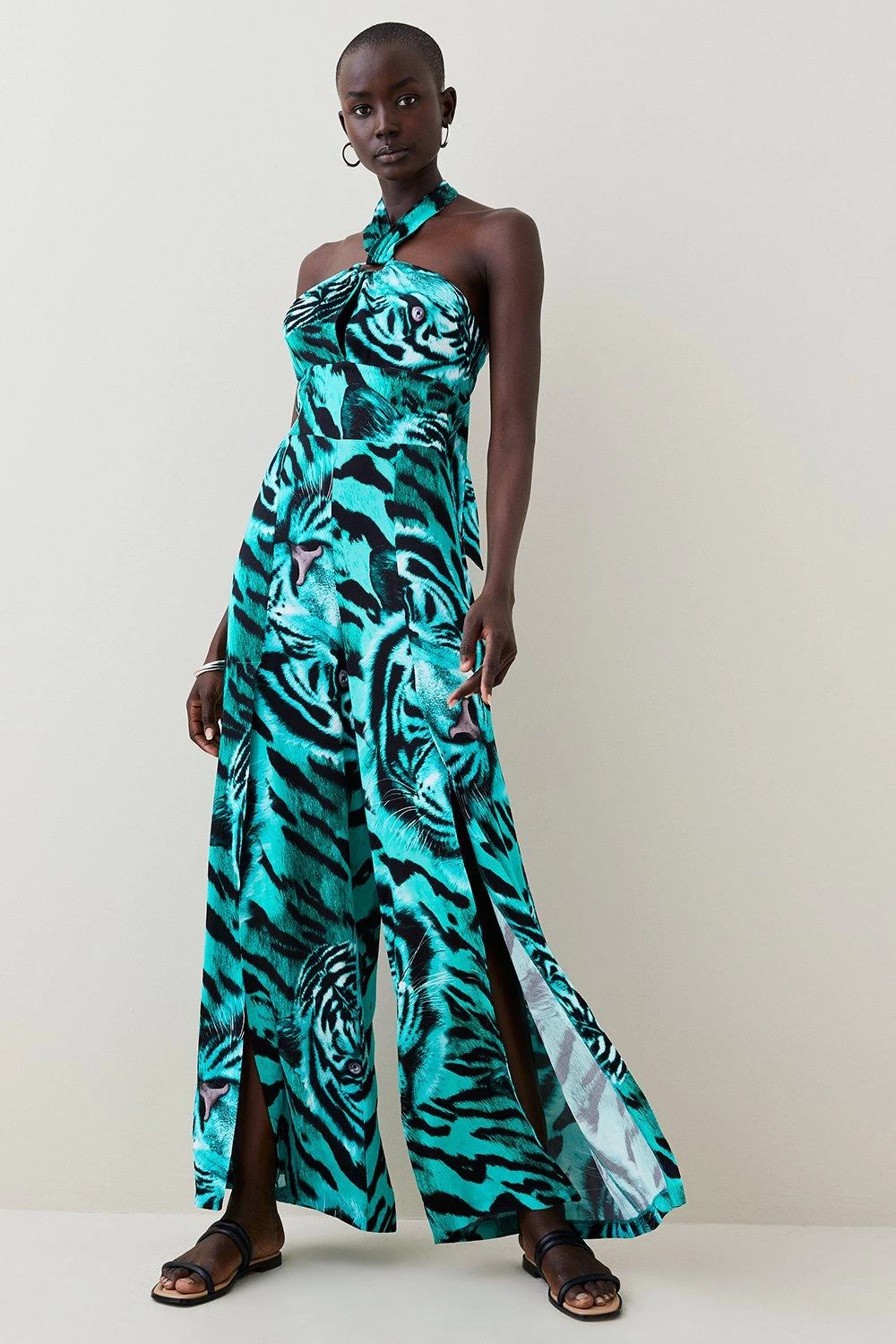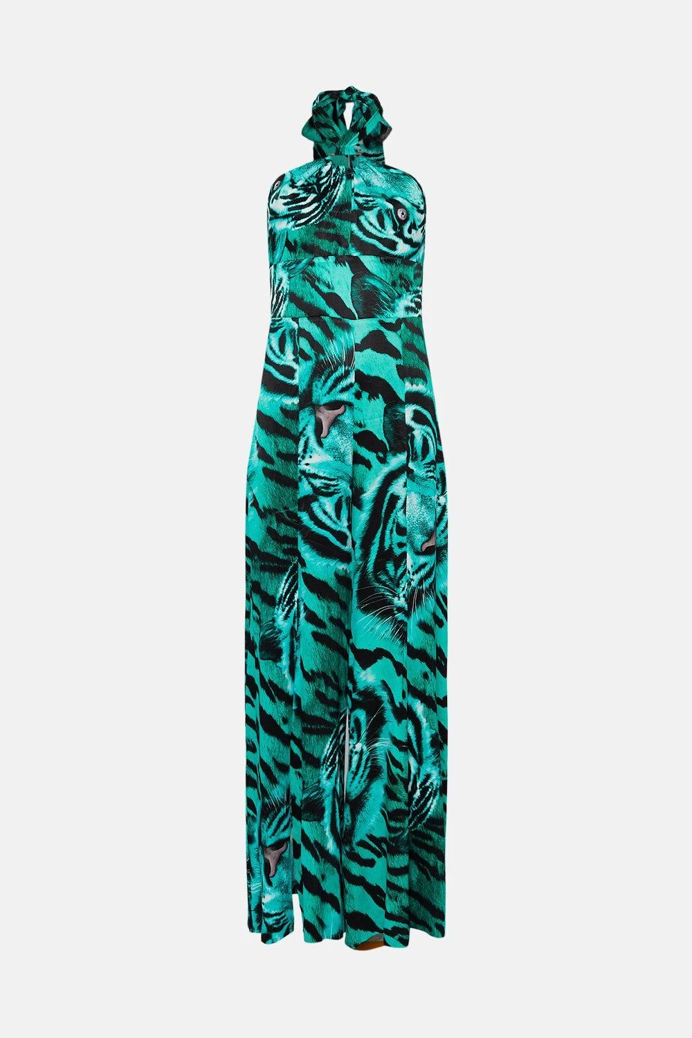 Made for print lovers, this flowing jumpsuit comes emblazoned with a head-turning tiger motif in shades of colour-pop turquoise. It shows off twisted halter-neck straps that tie elegantly at the back of the neck, sultry split-detail trousers and a bust-enhancing bandeau neckline.