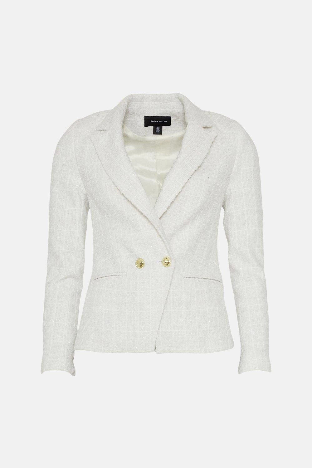 Gleaming gold buttons and textured tweed make this tailored blazer a stylish addition to your cover-up collection. It shows off sharply notched lapels, double-breasted closures and slip pocket detailing to add to its dressed-up allure. Style it with the coordinating mini skirt for a match made in sartorial heaven.