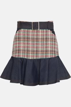Give in to the leg-lengthening appeal of this flirtatious mini skirt. Marrying heritage-style tweed with dark indigo denim, it blends textures to perfection. The high waistline is accented with a buckled waist belt, whilst the hem features a flared peplum trim for maximum elongating appeal.