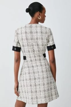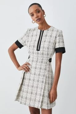 This classic designs adds a dignified touch to any wardrobe. Tweed fabrics adds a truly timeless feel to this piece, further emphasised by an A-line silhouette and pleated skirt. A front zip details allows for customisation.