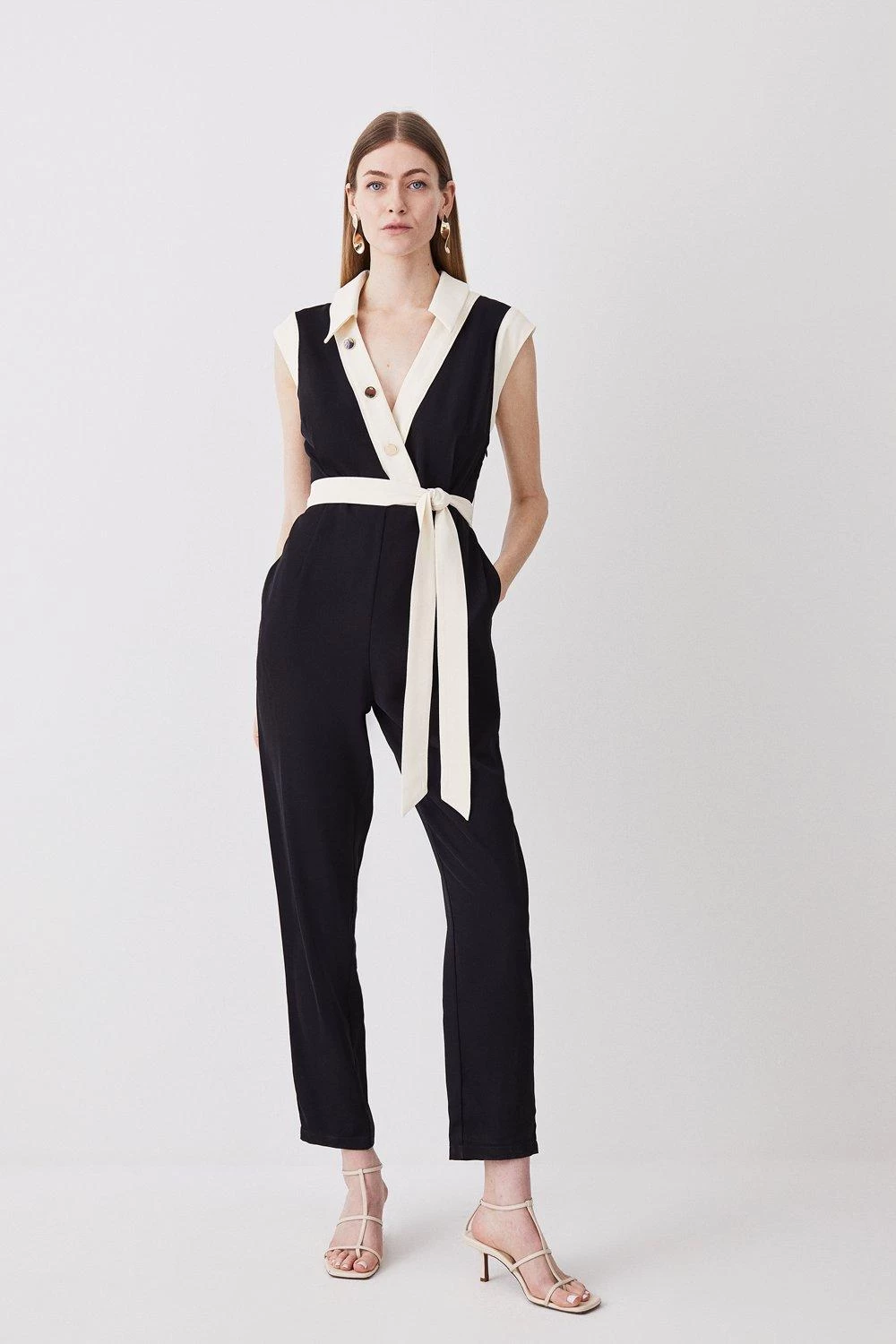 Crafted from lightweight twill fabric, this versatile one-piece makes a sophisticated addition to warm-weather wardrobes. A contrast panel detail adds a sleek aesthetic, while polished buttons and a collared neckline adds a refined finish.