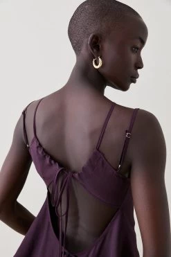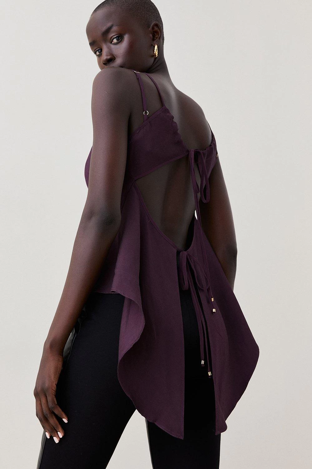 This cami top is a statuesque foray into contemporary design. Defined by a caged neckline and artfully draped cutout back, pair this piece with timeless denim for a twist on tradition.