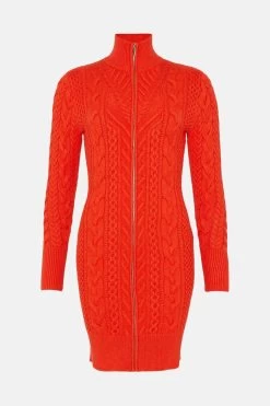 Texture is the name of the game when it comes to this luxe cable-knit mini dress. Detailed with a sporty full-length zip and high, funnel neckline, it instantly revamps a traditional technique for a bold new take on winter knitwear.